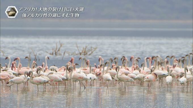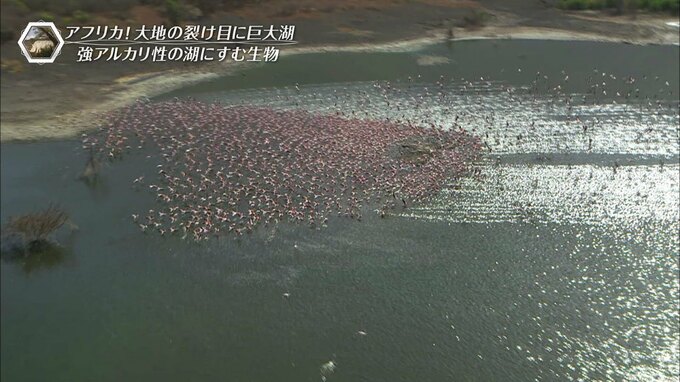 この大地溝帯の谷底に水が溜まり、湖がいくつもできました。ケニアにある、そうした3つの湖を世界遺産に登録したのが「グレートリフトバレーの湖群」です。ボゴリア湖はそのひとつで、水質は普通の生物では生きていけないほどの強アルカリ性。この過酷な環境に適応したのがフラミンゴです。