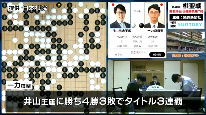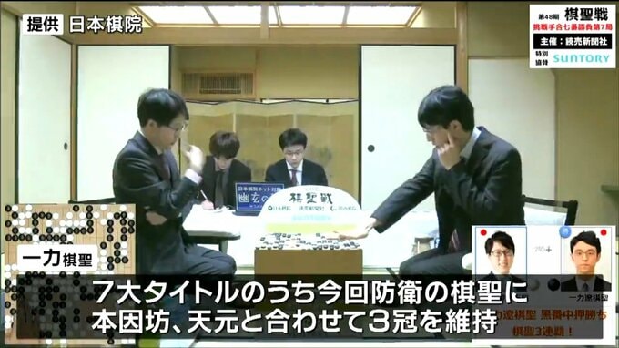 また、7大タイトルのうち今回防衛した棋聖に本因坊、天元と合わせて3冠を維持しました。