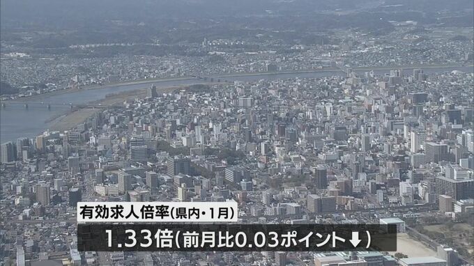 宮崎県内の1月の有効求人倍率は、前の月を下回り1.33倍でした。宮崎労働局によりますと、1月の求職者数は2万855人、企業の求人数は2万7832人で、有効求人倍率は前の月より0.03ポイント低い1.33倍でした。業種別の…