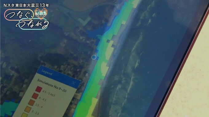 津波で、漂着物が住宅の近くまで押し寄せていた。シミュレーションでは、このエリアの浸水の深さは黄色で示された最大2.5メートル~3メートル。