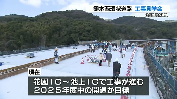 熊本市が渋滞対策などのために整備を進める熊本西環状道路で工事現場の見学会が開かれました。熊本西環状道路は下硯川町の国道3号植木バイパスから花園インターまでは既に開通していて、現在、花園インターと池上…