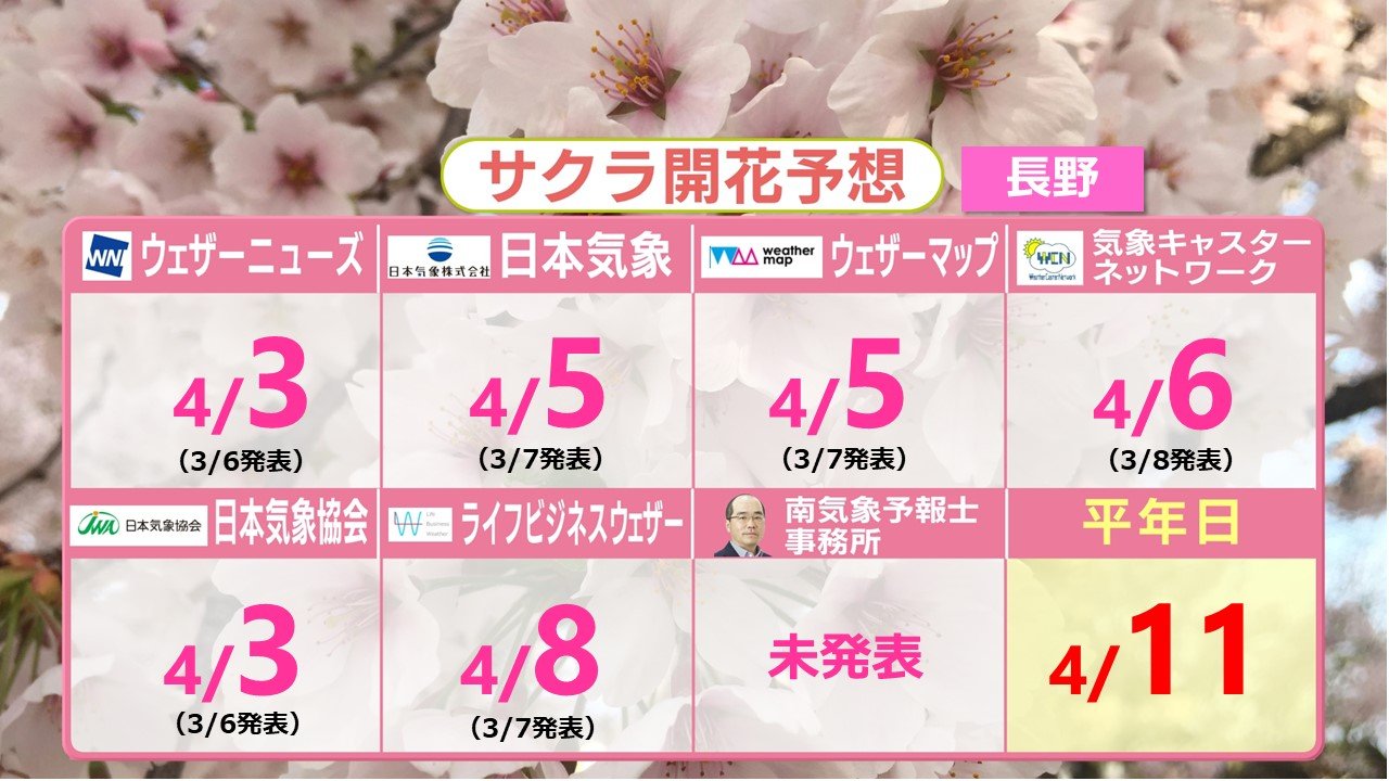 北陸や関東甲信では平年よりも早めの開花を予想する地点が多くなっています。東京を最も早いと予想しているのは4つの気象会社です。