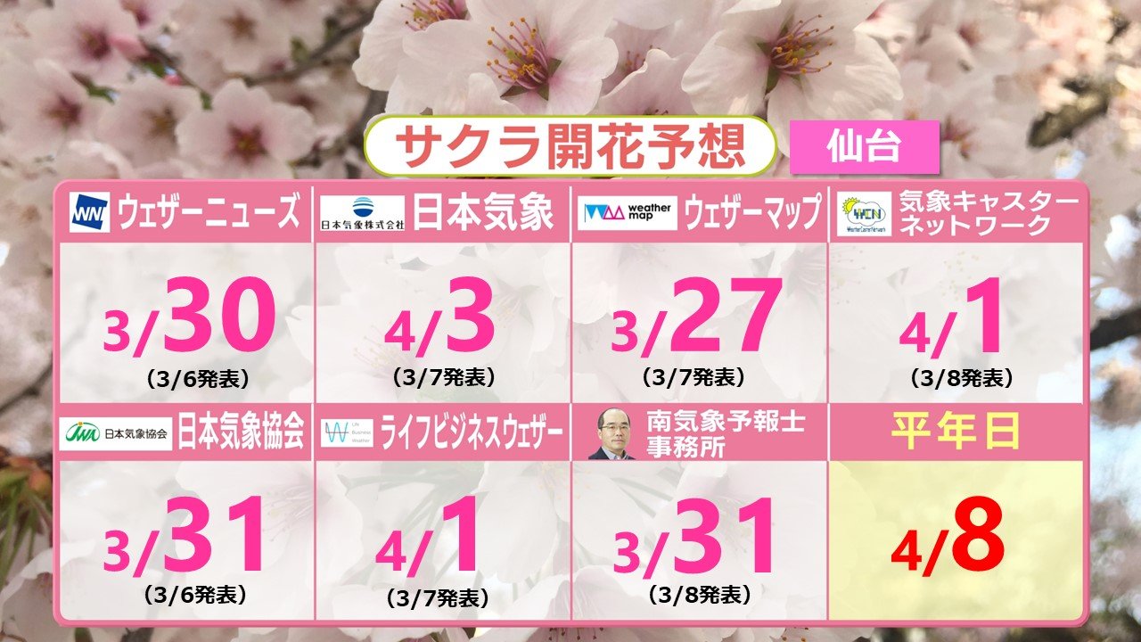 仙台でも3月中には開花すると予想している会社があるなど、桜前線の北上は平年よりも早いペースが予想されています。札幌でも4月のうちに開花を予想する会社が多くなっています。ただ北日本の開花予想日は各社で大きなバラツキがみられます。