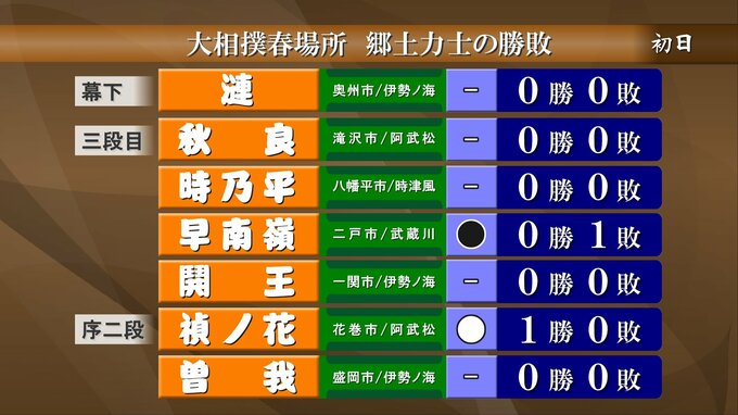 岩手・盛岡市出身の小結錦木が横綱照ノ富士を破る 大相撲春場所 IBC岩手放送 2024年3月10日(日) 17:57 国内 三段目の早南嶺は負けて黒星先行。序二段の禎ノ花は勝ってうれしい白星スタートです。このほかの郷土力士の取り組みはありませんでした。