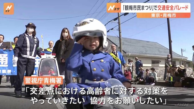 東京・青梅市では、「観梅市民まつり」に合わせて警視庁が交通安全パレードを行いました。白バイ隊員などおよそ40人が参加して300メートルにわたり練り歩きました。警視庁・青梅警察署は、「交差点における高齢者…