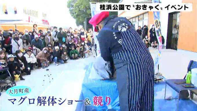 会場では大月町産のマグロの解体ショーや競りが行われたほか、「おきゃく」には欠かせない地酒(じざけ)の試飲コーナーも設けられました。