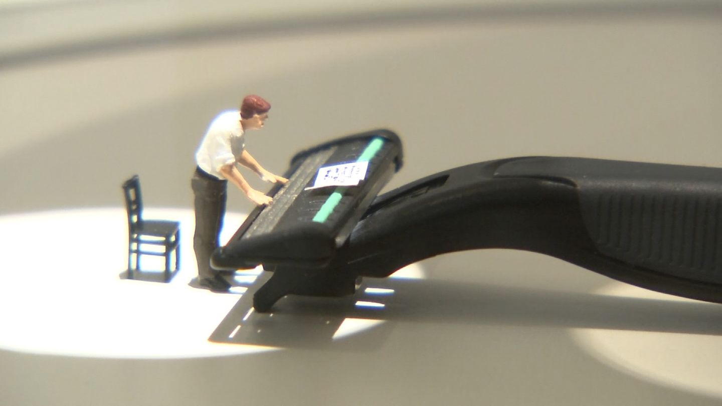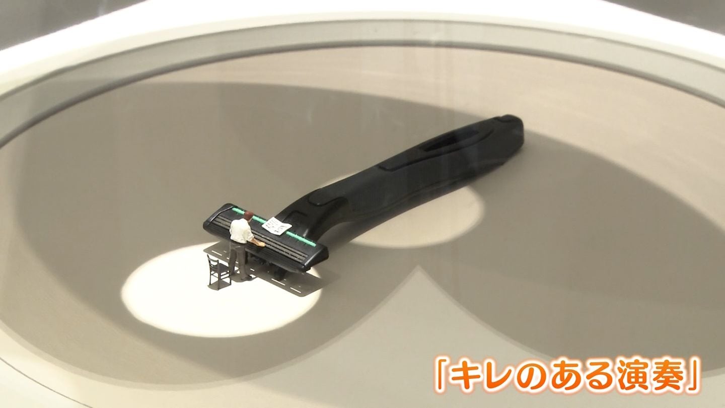 「作品のタイトルもユニークです。例えばこちらのカミソリをピアノに見立てた作品、タイトルは『キレのある演奏』です。」