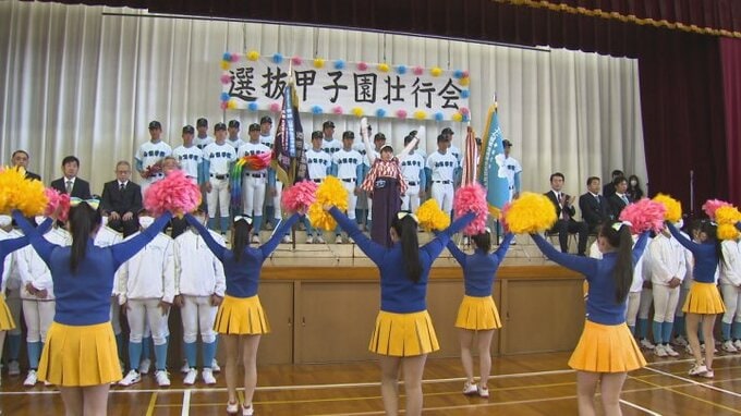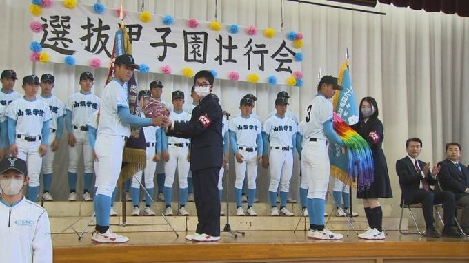 壮行会では全校生徒らが拍手で迎える中、去年のセンバツの優勝旗を手に野球部の選手たちが入場しました。