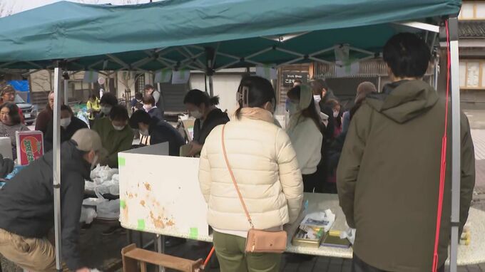 地元商店の営業再開のきっかけになればと、輪島市のわいち通りで開かれた復興市。茶碗蒸しに寿司、えがらまんじゅうなどが並び、午後2時のオープンから多くの客が列を作っていました。