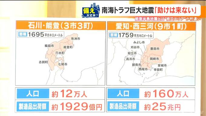 東京都には1400万人います。ということは、この能登で起きたことが他地域で起きたらどうなるかって考えるだけで、はるかに大きなことが起きる。名古屋だけじゃなく、大阪も、さらに西日本全域が被害を受けると思うと、これは誰も助けに来れないぞということがわかります。