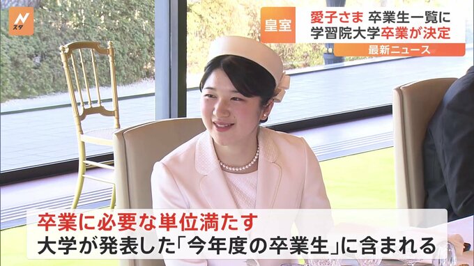 天皇皇后両陛下の長女・愛子さまが、学習院大学を卒業することが正式に決まりました。愛子さまは現在、学習院大学文学部の日本語日本文学科に通う4年生で、去年12月、「中世の和歌」をテーマにした卒業論文を提出…