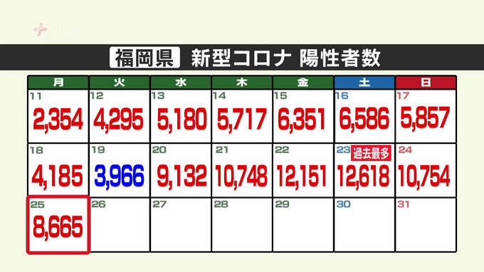 福岡県では25日、新型コロナウイルスの検査で新たに8665人の陽性が確認されました。前の週の同じ曜日よりも2倍以上に増えています。発表自治体別の内訳は、福岡市が2353人、北九州市が1080人、…