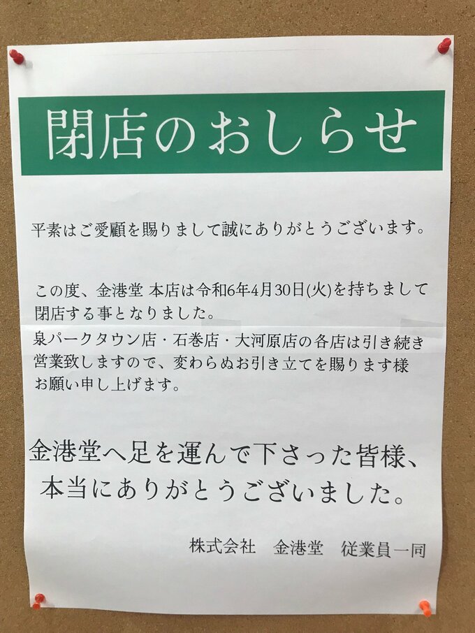【速報】”仙台の老舗書店”金港堂が本店を「4月30日」で閉店 泉パークタウン店など県内3店舗は営業継続 宮城 東北放送 2024年3月12日(火) 14:23 国内 仙台市青葉区にある書店、金港堂は12日、サンモール一番町商店街の本店を4月30日で閉店すると発表しました。 泉パークタウン店、石巻店、大河原店は引き続き営業するとしています。 店頭に掲出されたお知らせ