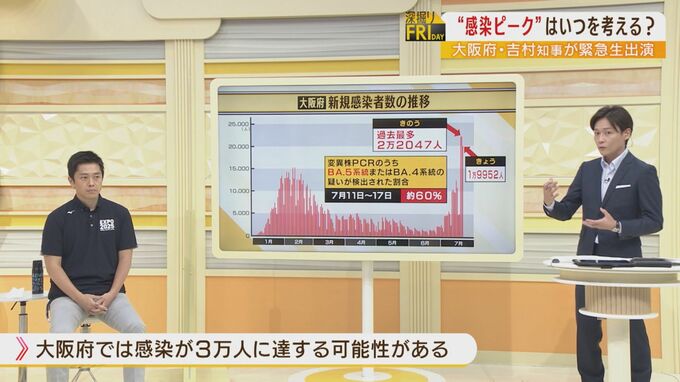 「現実にどこまで増えるかというのは非常に予測は難しいです。ただ、3万人に達する可能性は非常に高いと思っています。それをある程度我々としても想定をして、ひょっとしたらそれ以上に増えるかもしれないし、いかないかもしれない。これはわからないけども、ただ1つ言えることは、BA.5の置き換わりがまだ60%ですので、まだ今より増える可能性が高い。なので府民の皆さんには、おひとりおひとりの基本的な感染対策の徹底をお願いしたいと思います」
