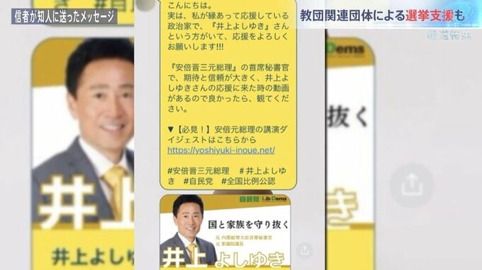 7月の参院選で、信者が投票を呼びかけた候補者のひとりが、自民党の井上義行氏だった。第一次安倍政権で総理秘書官を務めた井上氏。JNNの取材に対し、旧統一教会の「賛同会員」になっていることを認めた。 関連団体による選挙支援は、他の議員にも。