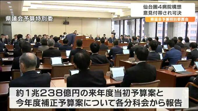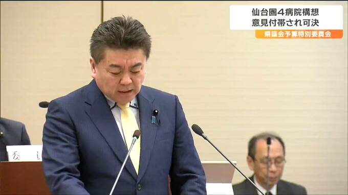12日開かれた宮城県議会予算特別委員会で、仙台医療圏の4病院再編構想を巡る予算案が病院関係者などへの丁寧な説明を求める意見を付け加えた上で、可決されました。