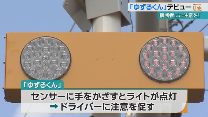 県内では初めての導入となる横断者注意喚起灯・通称「ゆずるくん」。横断歩道を渡ろうとする歩行者がセンサーに手をかざすとライトが点灯し、ドライバーに歩行者の存在を知らせ、注意を促します。