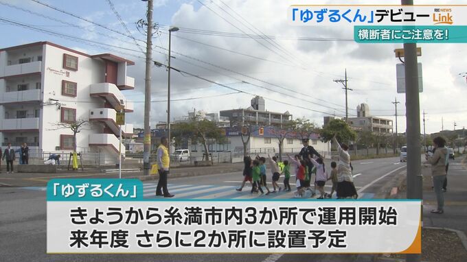 信号機のない横断歩道を歩行者が渡るさいにドライバーに注意を促す、その名も「ゆずるくん」の点灯式が糸満市で行われました。