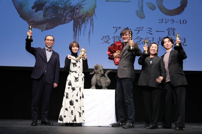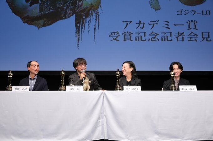 12日、映画「ゴジラ-1.0」が、米国ハリウッドで開催された第96回アカデミー賞で視覚効果賞を獲得したことを記念し、羽田空港で受賞記念会見が行われました。山崎貴監督・VFXディレクターの渋谷紀世子さん・3DCGディレクターの髙橋正紀さん・エフェクトアーティスト/コンポジターの野島達司さんが登壇しました。