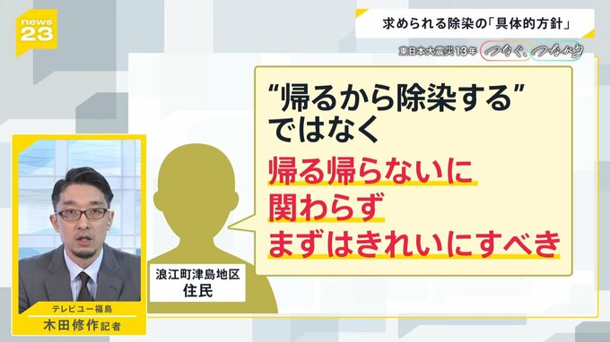 浪江町津島地区の住民は「“帰るから除染する”ではなく、帰る帰らないに関わらず、まずはきれいにすべき」というふうに話しています。この帰る帰らないが、除染の条件になっていることに対しても疑問の声が上がっています。