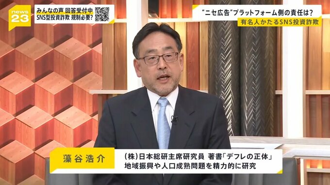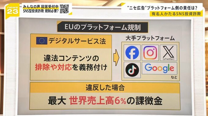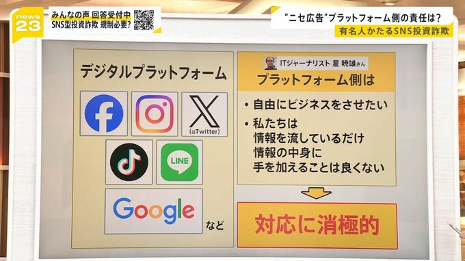ITジャーナリストの星さんのお話では、私たちがよく利用するFacebookやInstagram、X、TikTok、LINE、Googleなどデジタルプラットフォーム側の考え方としては、自由にビジネスをさせたい。彼らは情報を流しているだけで、情報の中身に手を加えることはよくないという考え方があるそうで、結果としてこうした対応に乗り出すことに消極的になってしまうと見ています。
