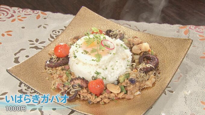 さらに、海の近く大洗町の「朝日堂」には驚きの「いばらきガパオ」がありました。地元野菜と地魚のカルパッチョが有名な居酒屋ということもあり、彩り鮮やかな野菜を入れた後にタコとシラスをたっぷりと!地元を盛り上げたいという想いから、「いばらきガパオ」(1000円)に名産品を入れちゃったんです。