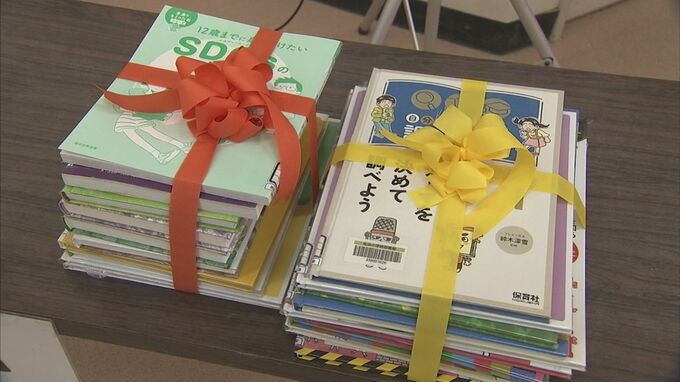 13日、学校で贈呈式が開かれ、児童の代表に本が手渡されました。