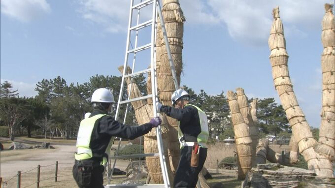 日頃から湊山公園の管理を行っている作業員7人が、脚立などを使い、手際よく、ソテツに巻かれたこもを一つ一つ外していきました。