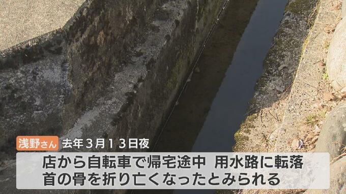 いまから1年前の3月13日の夜、浅野さんは仕事を終えて自転車で自宅に向かう途中、命を落としました。用水路に誤って転落、首の骨を折ったとみられています。