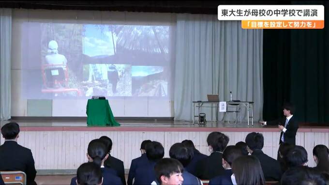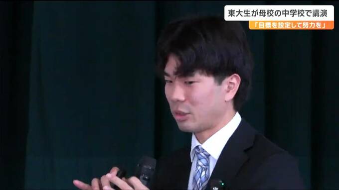 宮城県白石市出身で東京大学に入学した現役の大学生が13日、母校の中学校で講演しました。勉強と部活を両立させるコツを伝授するとともに、「目標を設定して努力を」と生徒たちを激励しました。