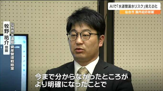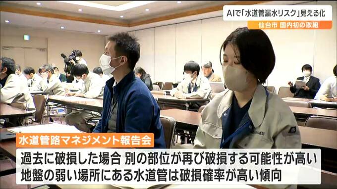 仙台市水道局では13日、AIを使って算出された水道管の評価が職員に報告されました。報告会では、水道管の老朽度合いについて過去に破損した場合、別の部位が再び破損する可能性が高いことや地盤の弱い場所にある水道管は破損確率が高い傾向にあることが分かりました。