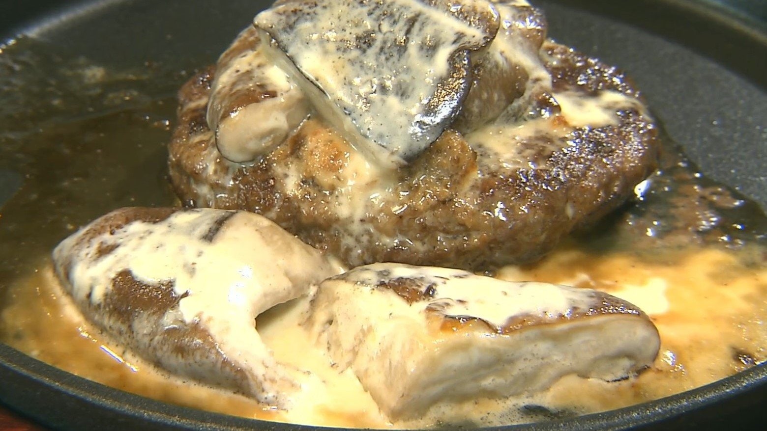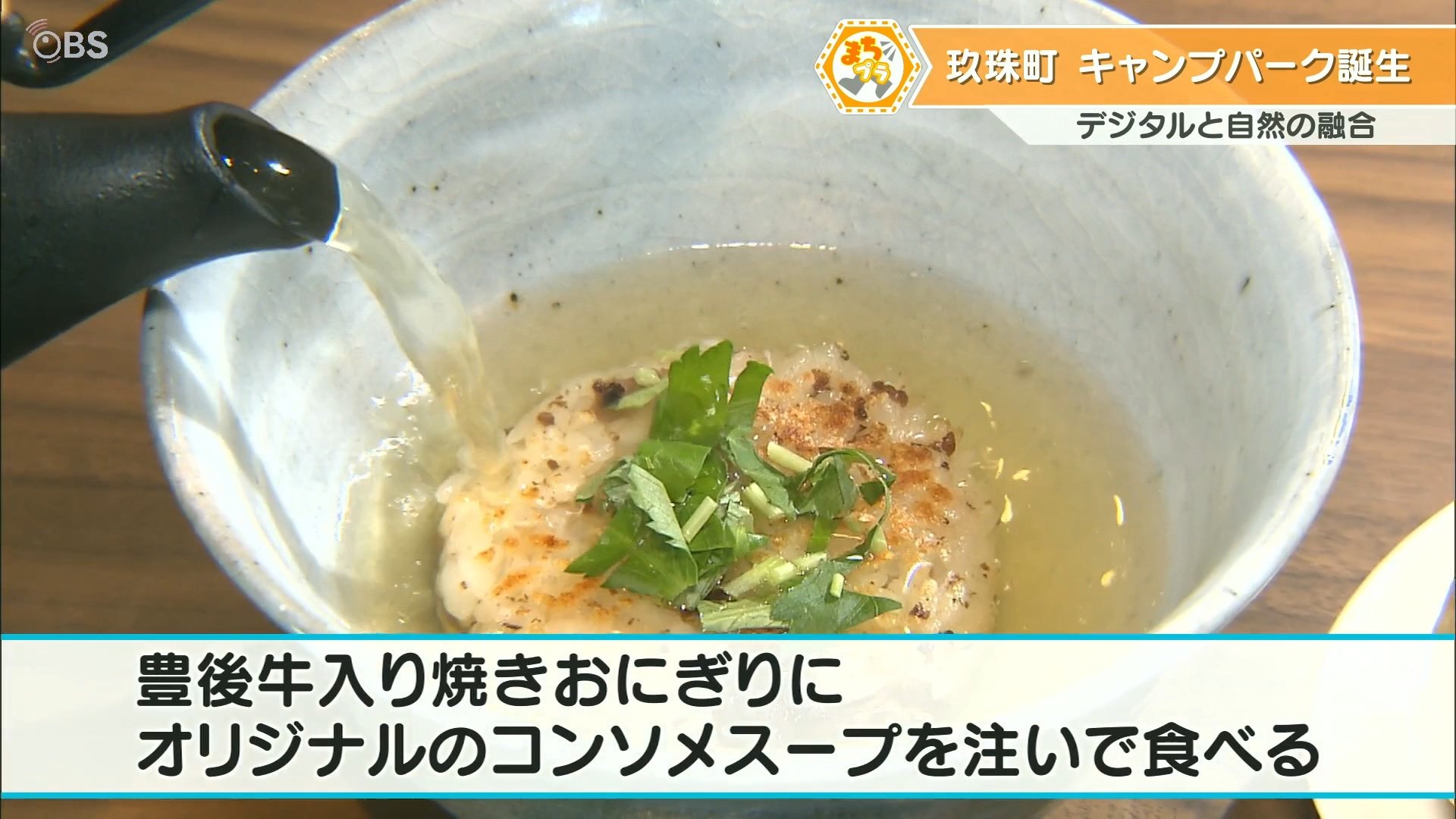 ハンバーグには豊後牛と地元の生シイタケを使用していて、和洋のダブルソースで仕上げています。また豊後牛入りの焼きおにぎりにオリジナルのコンソメスープを注いで食べるメニューはイチオシです。