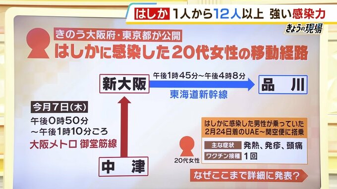 ――ヨーロッパを中心に世界的に流行している「はしか」。国内ではUAEから関西空港に帰国して、はしかに感染した20代女性の移動経路を行政が公開しました。3月7日午後0時50分から午後1時10分ごろ、大阪メトロ御堂筋線・中津駅から新大阪駅まで移動。午後1時45分から午後4時8分の間、東海道新幹線に乗って品川まで移動したということです。