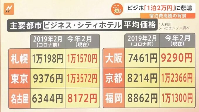 「都心のビジネスホテルが高い。インバウンド価格になったのかな」