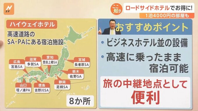 鳥海さんがおすすめしてるポイントとしては、ビジネスホテル並みの設備と高速に乗ったまま宿泊ができる。旅の中継地点として便利だということです。具体的にどんなホテルがあるのでしょうか。