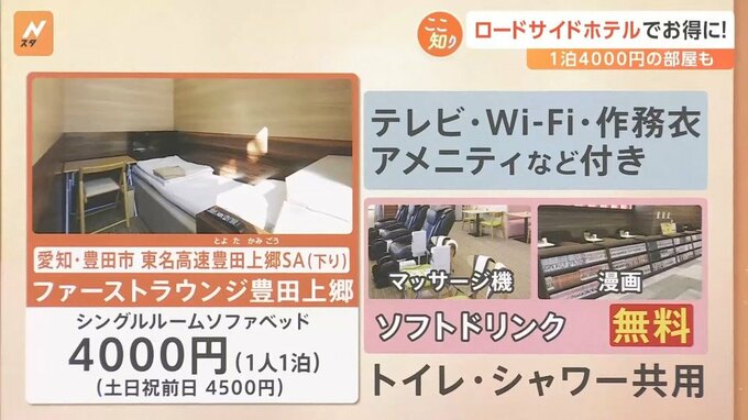 愛知県・豊田市の豊田上郷サービスエリアにある「ファーストラウンジ豊田上郷」。シングルルームソファベッド1人1泊で4000円(土日祝前日4500円)です。テレビ・Wi-Fi・作務衣・アメニティなども付き、マッサージ機や漫画、ソフトドリンク全て無料、トイレ・シャワーは共用だということです。
