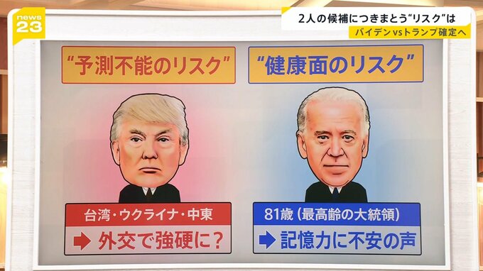 一方、バイデン氏が勝利した場合、健康面のリスクがある。81歳の、過去最高齢の大統領ということで、すでに記憶力に不安の声が上がっています。