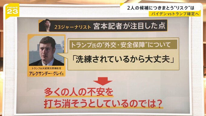 news23ジャーナリストの宮本記者によると、トランプ氏には、予測不能のリスクがある。例えば、台湾、ウクライナ、中東など、外交で強硬姿勢に出るリスクです。