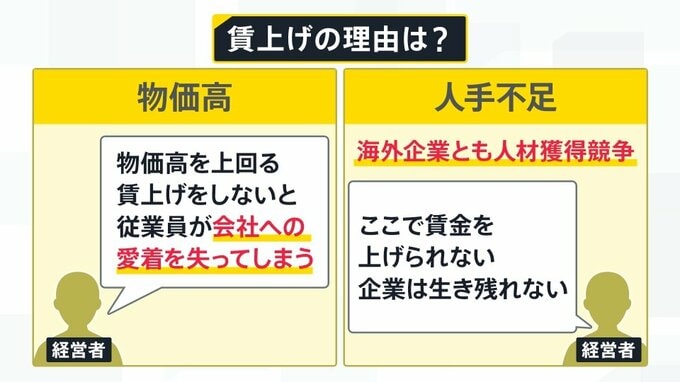 そしてもう一つは人手不足。現在、人手不足が深刻化していく中で、企業は国内だけではなく、海外の企業とも人材獲得競争をしています。そういった中で大企業の経営者に話を聞くと、「ここで賃金を上げられない企業は、もう企業として生き残っていけないだろう」というような危機感を口にしていたので、この二つが相まって、大幅な賃上げが実現したというふうにみています。