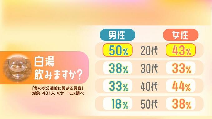 去年12月にとられた「白湯を飲みますか?」というアンケートでは、20代男性の50%、20代女性の43%が白湯を飲んでいるという結果に。