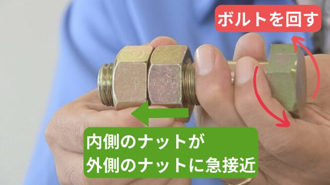 ボルトを緩む方向にクルクルと回転させると、内側のナットが外側のナットを追いかけるように急接近して、接触。
