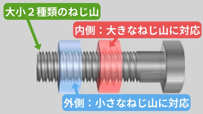 内側のナットは大きなねじ山、外側のナットは小さなねじ山とかみ合うように作られている。