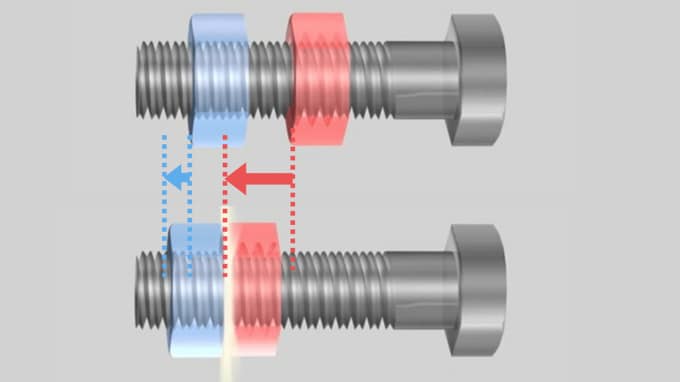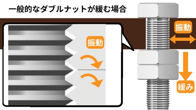 しかし、それも完璧ではない。ボルトに振動が加わり、2つのナットが同時に回転すると、どんどん緩んでしまう。