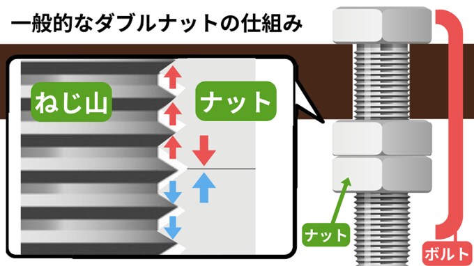 緩み防止のために広く使われている、「ダブルナット」という仕組みがある。2つのナット同士で強く押し合う力が生まれ、ボルトを2つのナットが逆方向に引っ張る状態になる。