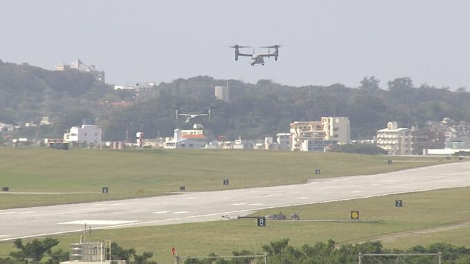午前8時50分ごろ、普天間基地に駐機するオスプレイがホバリングをはじめ、その後、基地の外へと飛び立ちました。普天間基地からはこれまでに4機が飛行していて、嘉手納基地周辺や那覇市の上空など県内各地で飛行する様子が確認されています。