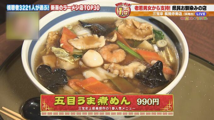 “三宝史上最高傑作の1番人気メニュー”とも言われる「五目うま煮めん」は豚肉やエビ、イカなど10種類の具材がたっぷりと入ってうまみが凝縮されています。「ラーメンといったら、ここ」「五目うま煮めんは忘れられない」などの声が寄せられました。