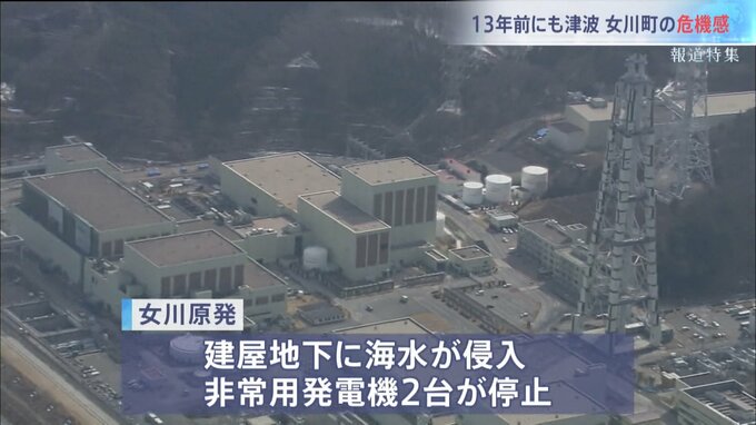 東日本大震災で女川町は15m近い巨大津波に襲われ、壊滅的な被害を受けた。女川原発にも津波が到達し、非常用発電機2台が停止。また外部電源5系統のうち4系統まで停止したが、原子炉は辛うじて冷温停止した。