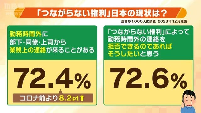 ――日本の現状です。「勤務時間外に部下・同僚・上司から業務上の連絡が来ることがある」と答えたのは72.4%、コロナ前より8.2ポイントアップしているということです。そして、「繋がらない権利によって、勤務時間外の連絡を拒否できるのであれば、そうしたいと思う人」が72.6%と高い水準です。