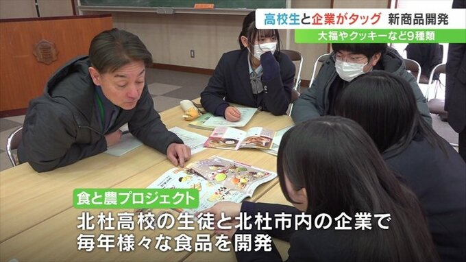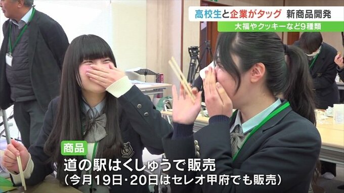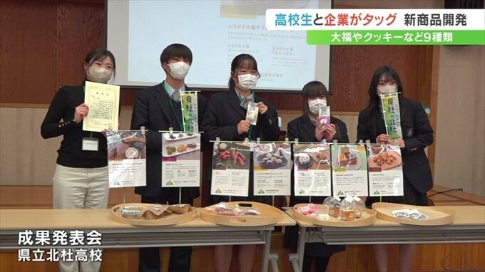 山梨県立北杜高校の生徒と北杜市内の企業がタッグを組んで開発した菓子などの新商品がお披露目されました。