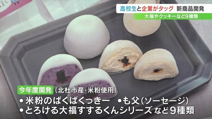 完成した商品はとろける食感が特徴の大福やワインの風味が楽しめるクッキー、餅とチーズが入ったソーセージ「も父」など9種類で、すべて北杜市産の米粉が使用されています。